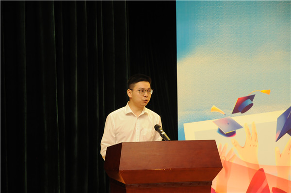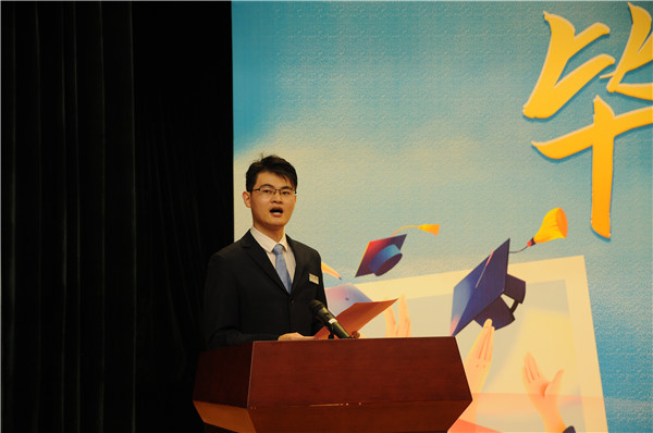 民航乘务学院专职辅导员饶德江作为辅导员代表发言。在同学们即将告别母校、开启人生新篇章之际,殷殷嘱咐同学们在毕业季角色转变过程中学会适应,从心理上、行动上、能力上完成角色转变,积极主动地适应社会的需求;养成坚持学习的习惯,不断提升自己的能力和学识,奋发进取,实现人生新的跨越;坚持人生理想,坚定人生信念,牢记“志高行远 厚德尚能”的校训,以实际行动践行“请党放心、强国有我”的铮铮誓言,做一名新时代的有为青年。